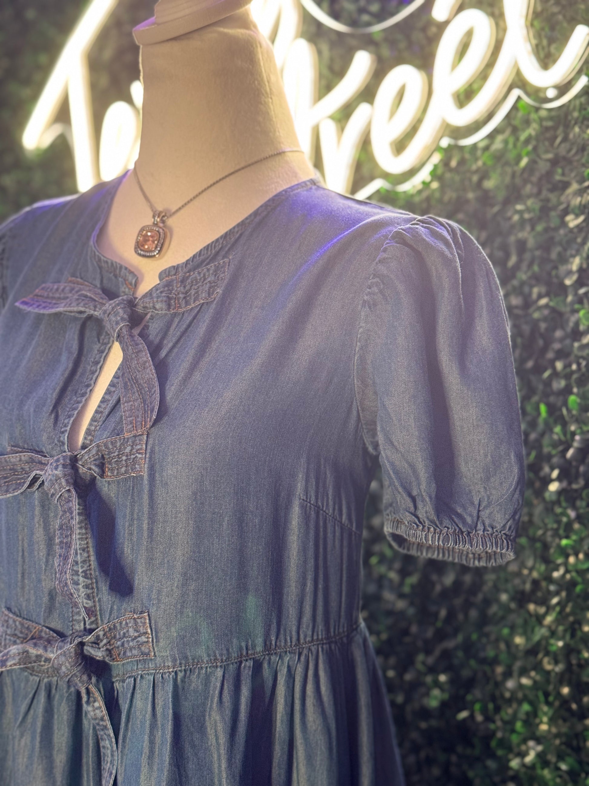 ROUND NECKLINE SHORT PUFF SLEEVES FRONT TIE DETAIL FRONT CUT-OUT DETAIL A-LINE DARK CHAMBRAY PATTERN MINI DRESS
