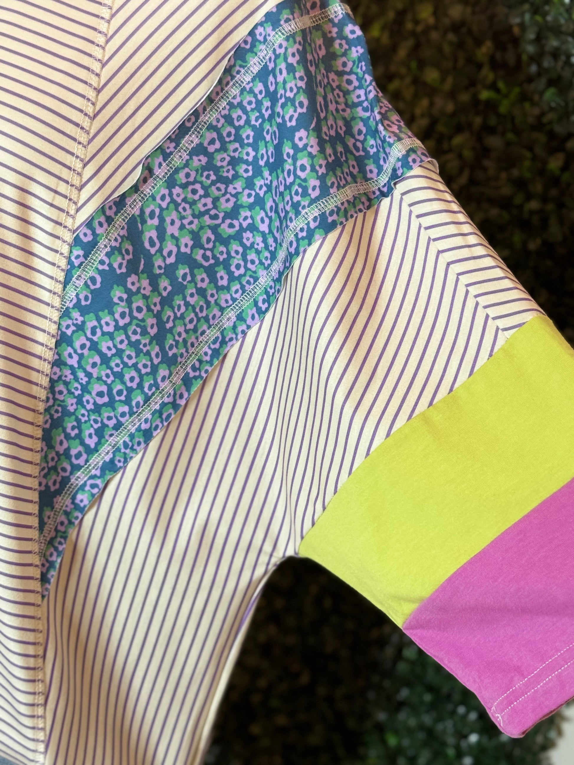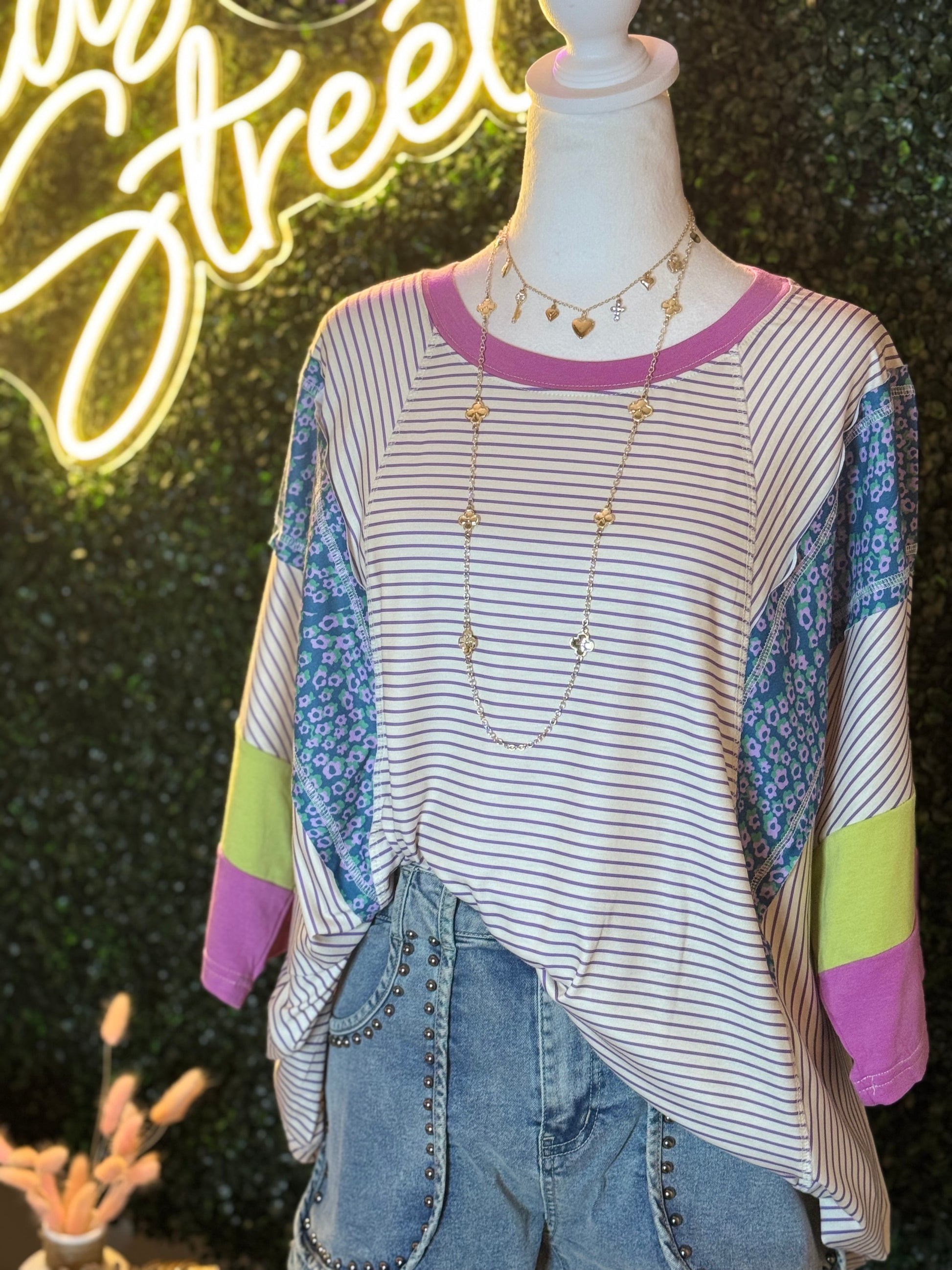 This playful multi-print jersey knit tunic is your go-to for effortless style on busy days. Light and airy, it runs large for a relaxed fit that keeps you comfortable all day. Pair it with biker shorts and sneakers for a casual vibe or dress it up with stylish denim for a fun date night look.