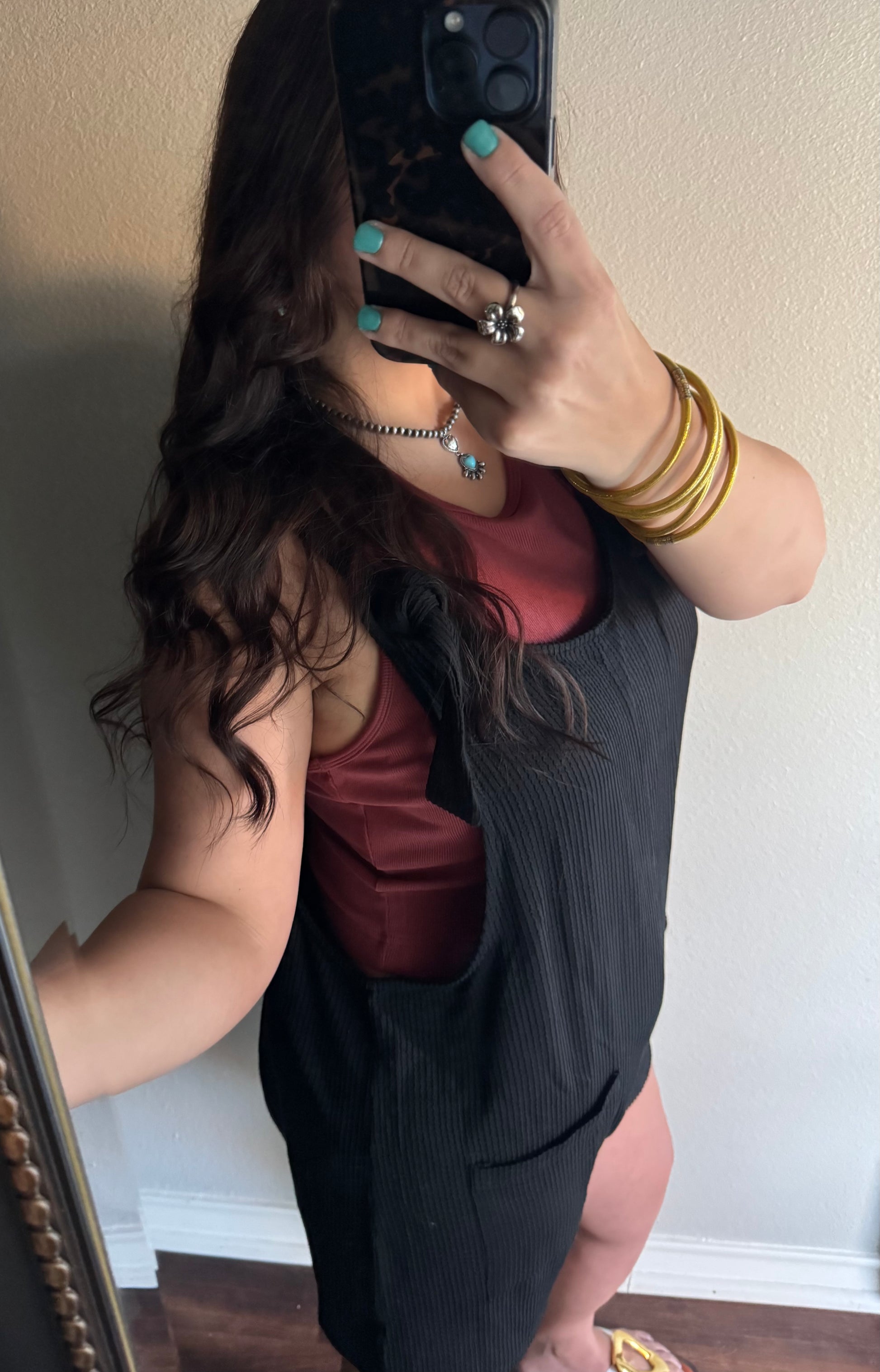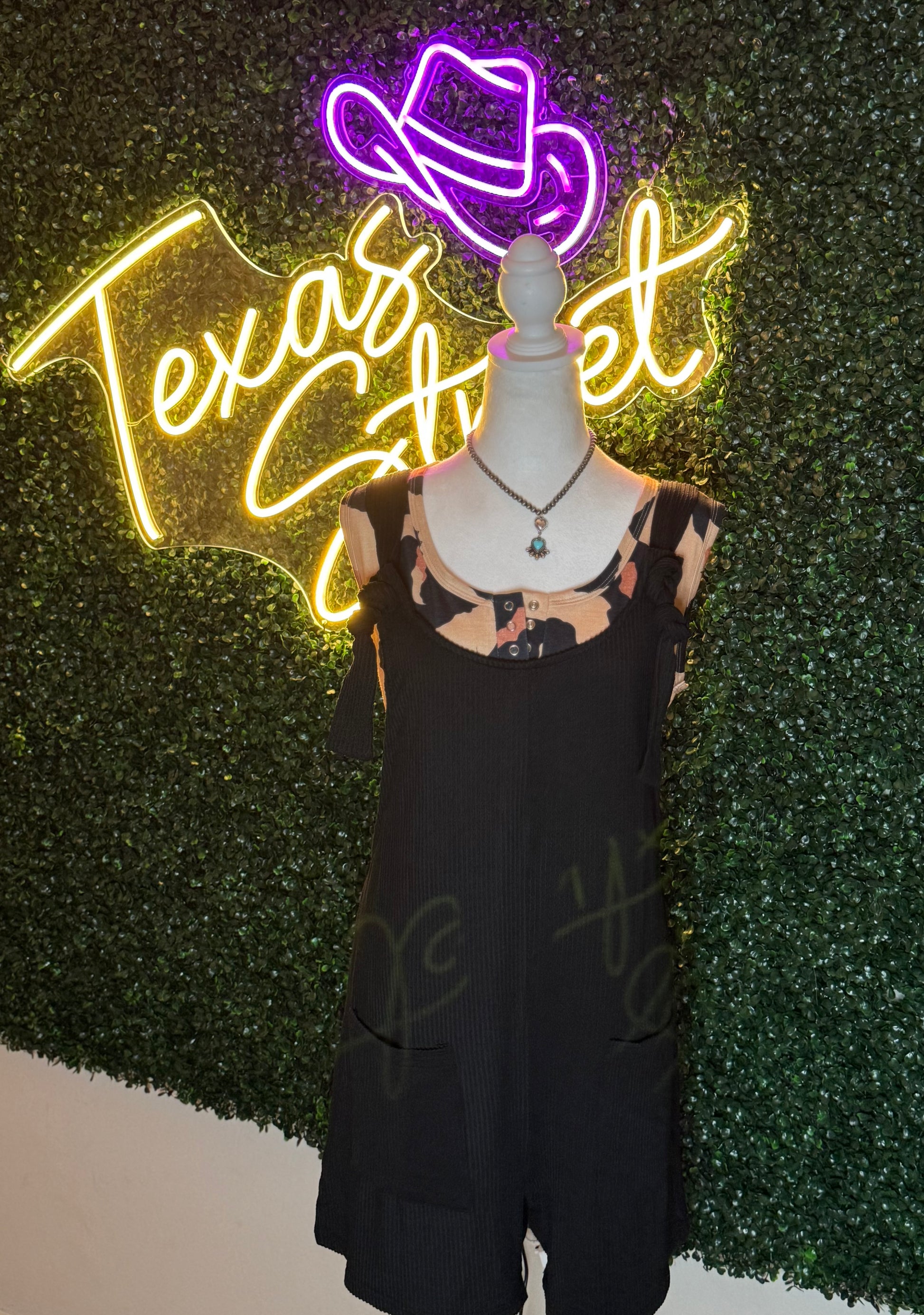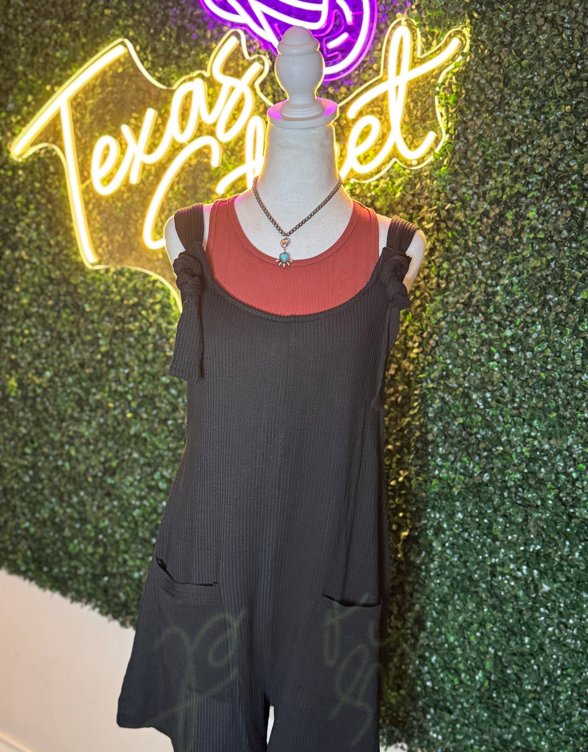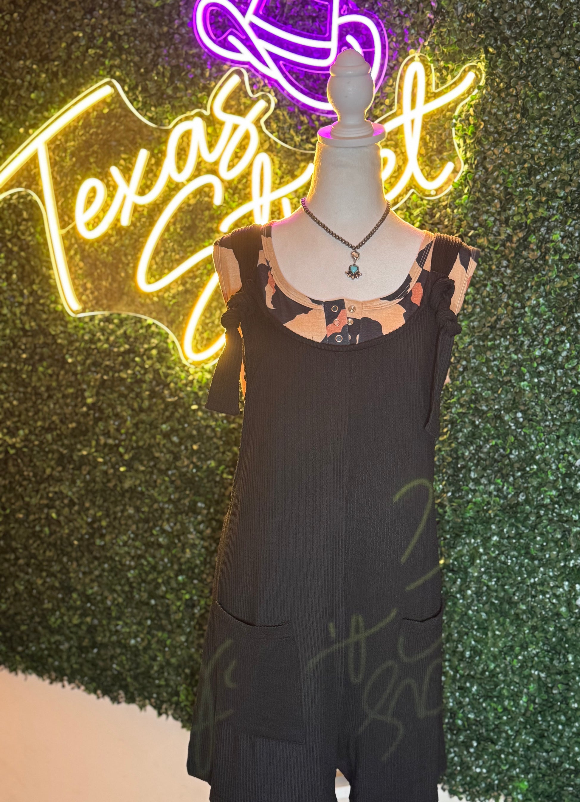 This romper is a stylish, versatile piece with trendy knot straps. Its classic black color suits day-to-night wear, while side pockets add practical appeal. Crafted from high-quality fabric, it offers a flattering, comfortable fit for any occasion. Knot straps at the shoulders add a chic, playful touch that stands out.